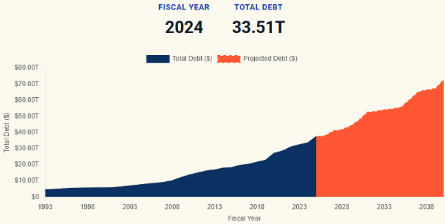 The United States federal government debt at the end of fiscal year (FY) 2000 was $5.67 trillion. It doubled to $11.91 trillion at the end of FY 2009. This doubled again to $26.95 trillion at the end of FY 2020. It stood at $33.51 trillion at the end of FY 2024 and it approaches $37.6 trillion at the end of FY 2025.