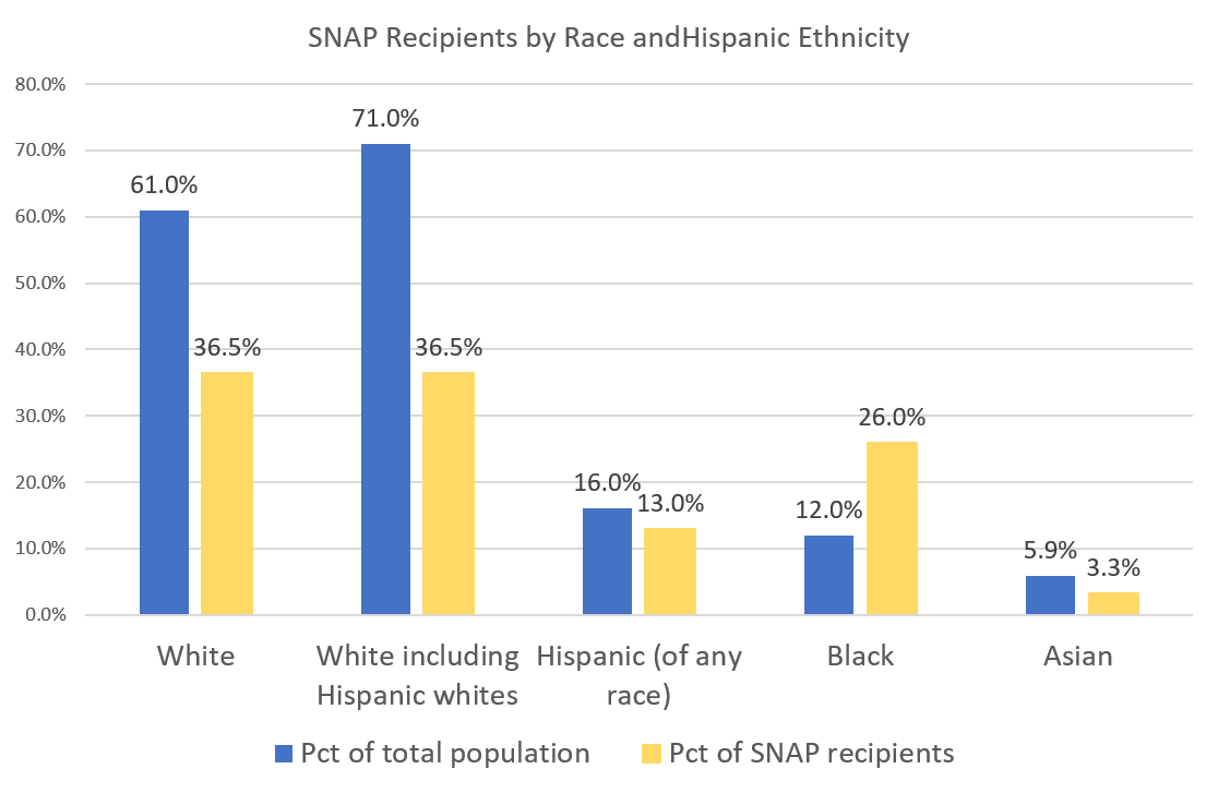 Source: “Characteristics of SNAP Households, 2019“, 2020 Census tables P3, P4, P7