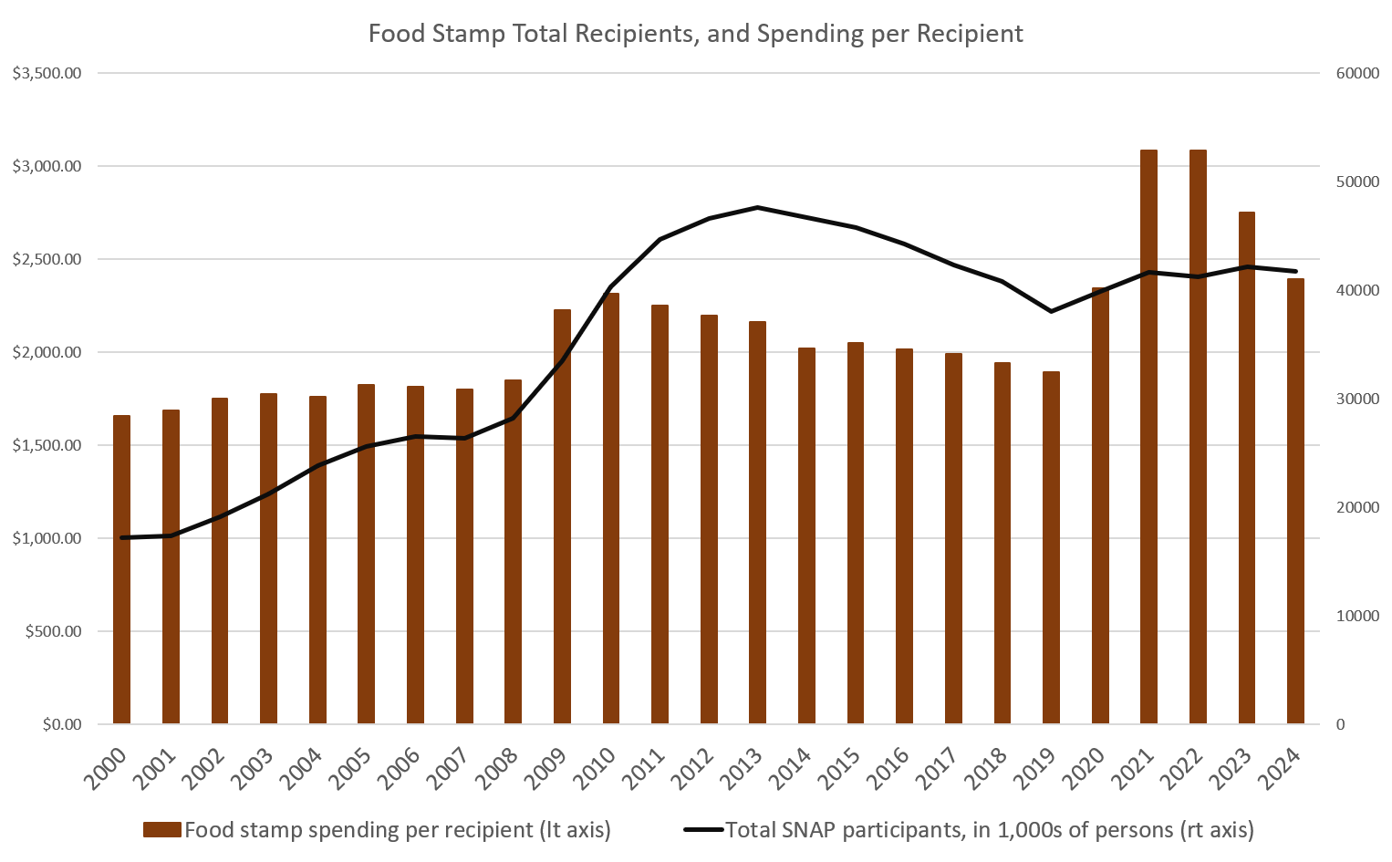 The number of food-stamp recipients has “only” increased by 47 percent over that same period, meaning that per-capita spending for recipients has gone up. In 2008, total SNAP spending per recipient was $1,847. By 2024, overall  per-recipient spending had increased by 30 percent, rising to $2,393.