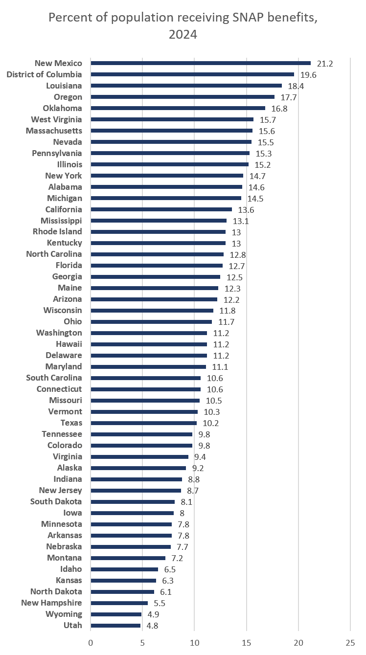 Nationwide, the total percentage of the population receiving food stamps can vary significantly by state, and region. Measured state-by-state, we find that more than one in five residents of New Mexico receive food stamps. In Utah, on the other hand, fewer than one in twenty receive food stamps.
