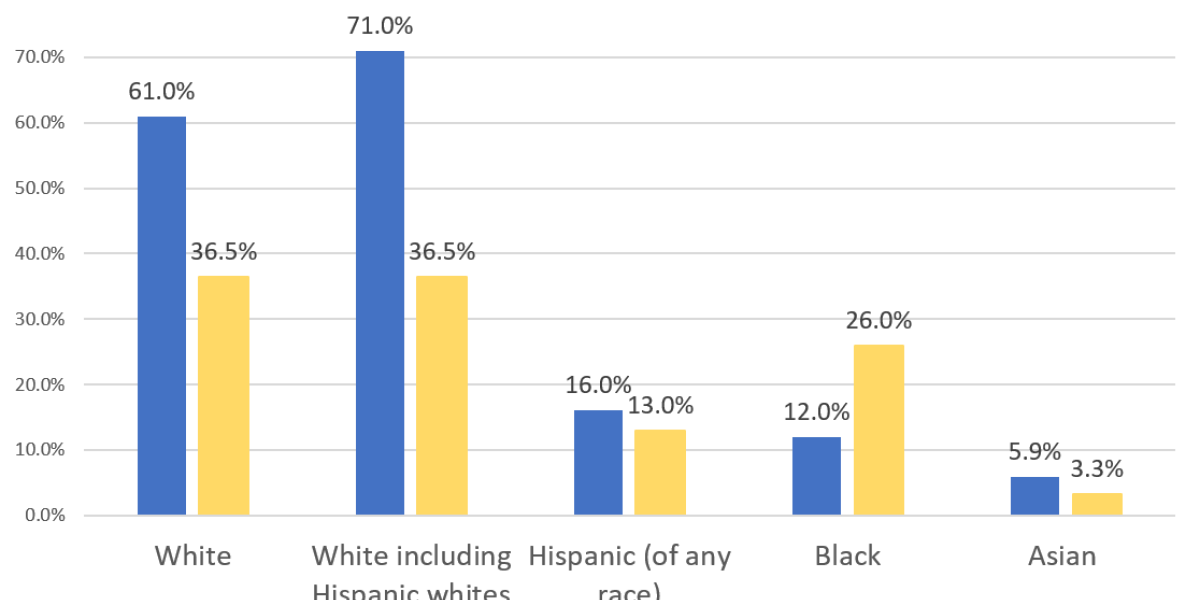 There are sizeable differences by race and ethnicity as well. Although they comprise 58 percent of the US population, non-Hispanic whites account for only 36.5 percent of all SNAP recipients. Blacks comprise about 26 percent of SNAP recipients although blacks are only 12 percent of the US population. Asians comprise 3.3 percent of the food-stamp recipient population. Those who self-identify as Hispanic (of any race) comprise 16 percent of the recipient population. (Note: according to the Census Bureau data used here, “Hispanic” is classified as an ethnicity and not a race. Since fifty percent of Hispanics self-identify as “white,” self-identified whites actually comprise 71 percent of the population, not 58 percent. (Pew studies suggest that 58 percent of Hispanics self-identify as white.)+