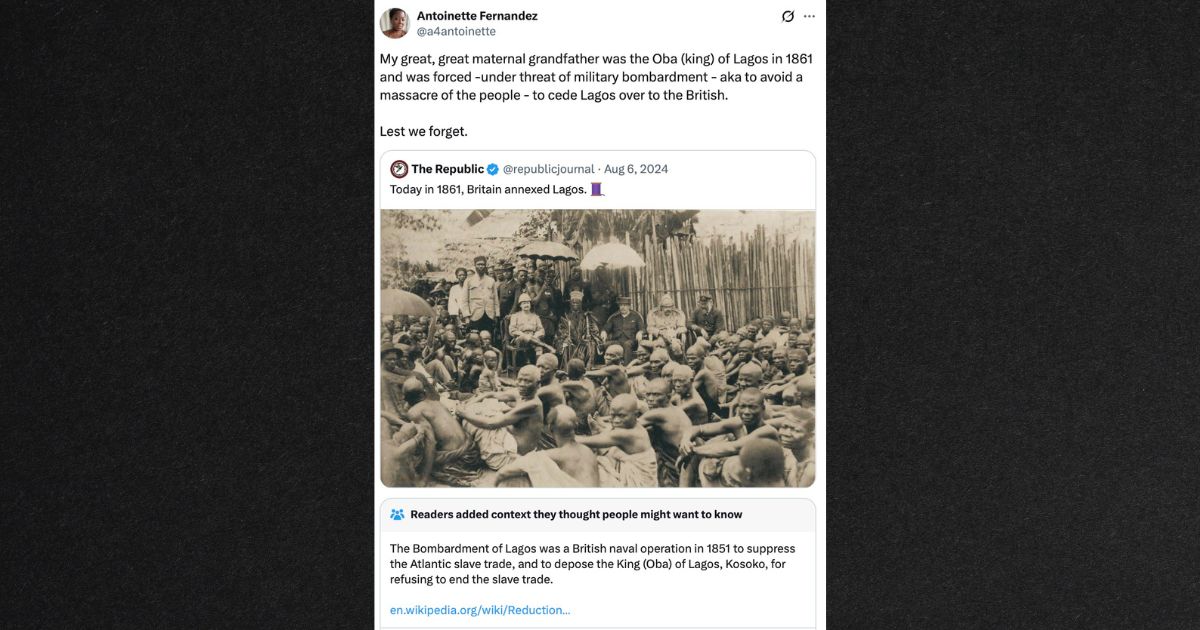 So first the post, which was made a little under two years ago, but only got attention now. In it, Fernandez quote-posted a thread about the British annexation of Lagos, the former capital of Nigeria, in 1861.