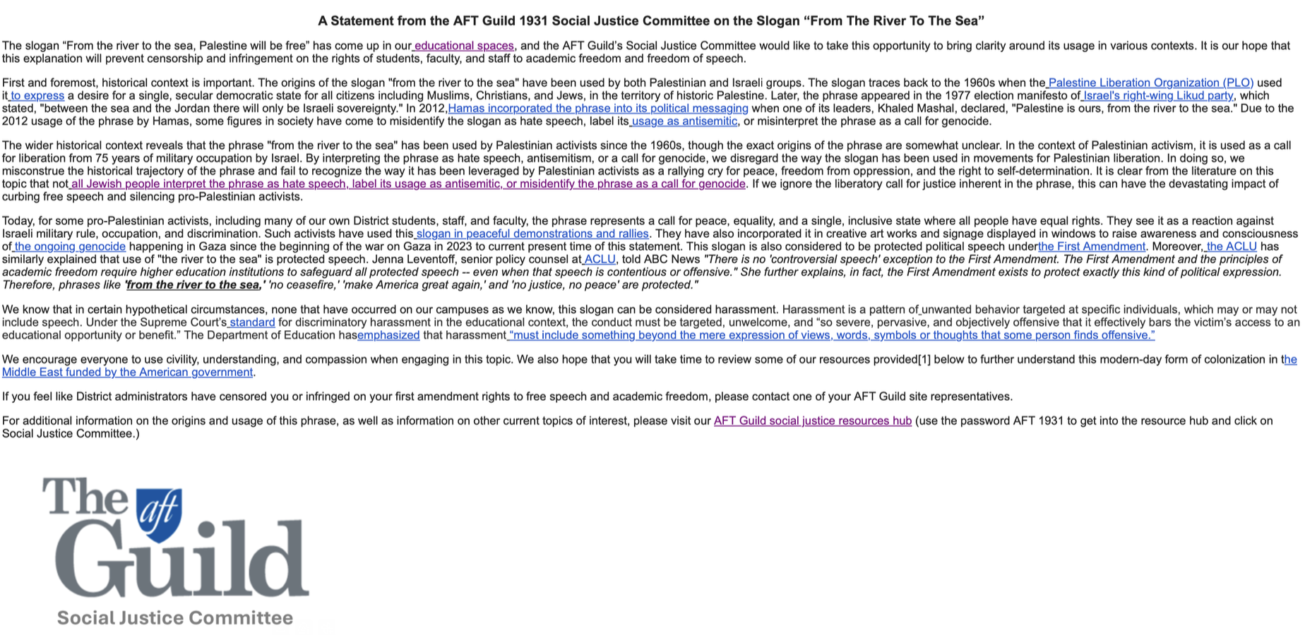 AFT Guild 1931’s Social Justice Committee said the “River to the Sea” chant has been “used as a call for liberation from 75 years of military occupation by Israel” and is a “rallying cry for peace, freedom from oppression, and the right to self-determination.”