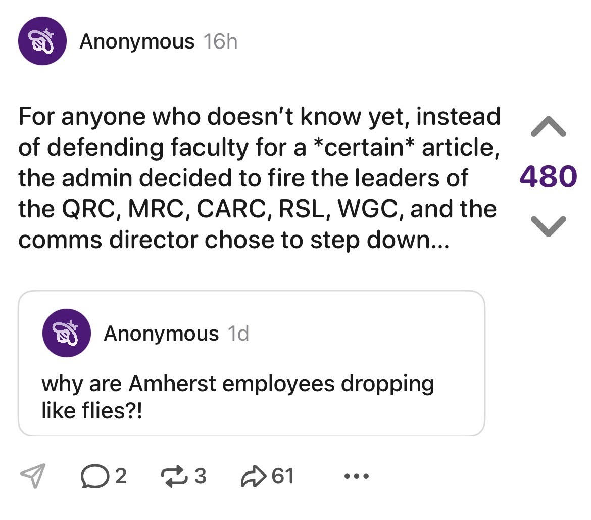 In another post, a student claimed that “the admin decided to fire the leaders of the QRC, MRC, CARC, RSL, WGG,” using abbreviations for the organizations led by the various administrators. Though Amherst has made no public statement about their departures, the school announced on Wednesday that a fifth official, Vice President for Communications Sandy Genelius, would retire in June.