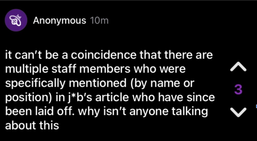 “It can’t be a coincidence that there are multiple staff members who were specifically mentioned (by name or positions) in j*b’s article who have since been laid off,” one student posted on Fizz, the campus social app, on January 11. “Why isn’t anyone talking about this[?]”
