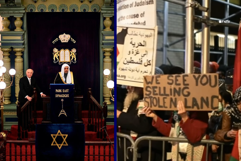 (L) Rabbi Arthur Schneier and Muslim World League Secretary General Mohammad Abdulkarim Al-Issa speak during an event on April 29, 2019 in the Park East Synagogue in New York City. (Photo via: JOHANNES EISELE/AFP via Getty Images) / (R) Screen capture of anti-Israel protesters outside of Park East Synagogue in Manhattan, New York, on Wednesday, November 19, 2025.