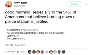 “[G]ood morning, especially to the 54% of Americans that believe burning down a police station is justified,” she wrote in another post.