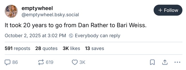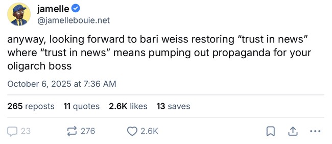 In its inevitable write-up this morning, Hollywood house rag Variety referred to Weiss as a “Digital Provocateur,” but to be fair, it posted the link on X instead of Bluesky because I guess even Variety is put off by the loons over there. Variety has a Bluesky account, but the paper took it dormant months ago.