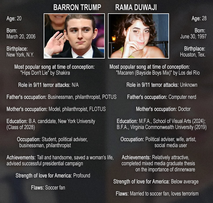 To gain a broader understanding of the Gen Z mindset and assess whether it should be considered normal to love terrorism in one’s twenties (or at any age), the Free Beacon conducted an extensive analysis comparing the lives and personalities of Barron Trump and Rama Duwaji. Enjoy!