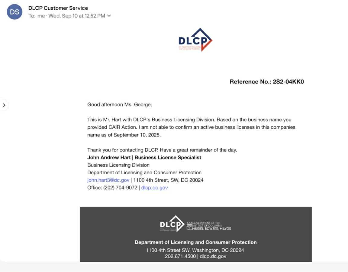 The report shows that the D.C. Department of Licensing and Consumer Protection could not locate CAIR Action’s Basic Business License when contacted by NCRI investigators in September and October.