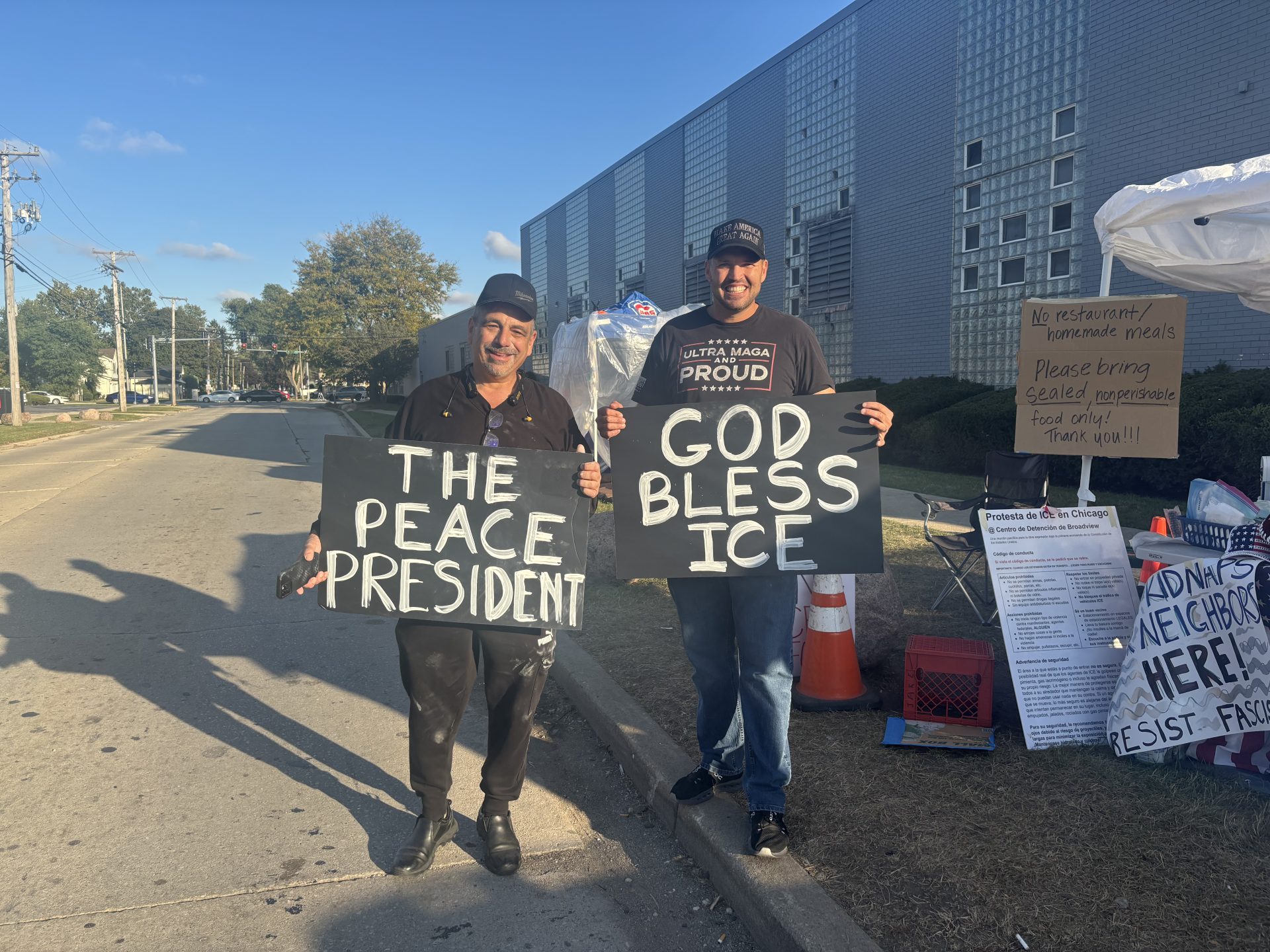 A poster flutters in the wind, bearing the name of a Chicago Police Department (CPD) officer who had allegedly aided in immigrant detention. An American flag also flutters. A pro-Trump counter-protester named Ben had driven to Chicago from Arkansas. He is holding a sign that says: “GOD BLESS ICE.” Some people honk in approval as they drove past. “I want them to know that America supports them and that we are not all crazy liberals,” Ben tells me. “We are not all these democratic socialists.”