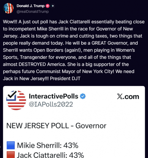 Trump responded to the poll on Truth social, endorsing Ciattarelli.