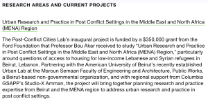 Columbia’s partnership with the Urban Lab involves studying “access to housing for low-income Lebanese and Syrian refugees in Beirut, Lebanon,” according to an announcement in 2018 when the project started. It also “aims to engage local residents and urban practitioners as active participants in advocating for and shaping inclusive post-war reconstruction planning practices and policies.”