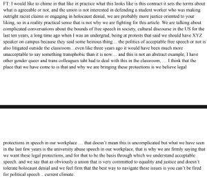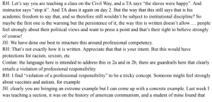 Plenty of protected First Amendment speech, including political activism, is likely of questionable propriety in the classroom and Columbia’s negotiators raised questions about the intent of the article. Rebecca Hirade, the dean for finance and operations for the Graduate School of Arts and Sciences, pointed out that the academic freedom article “would have protections for racism, sexism, etc” and noted that “[s]omeone might feel strongly about vaccines and autism.”