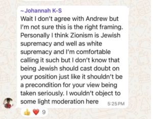 She also wrote, “Personally I think Zionism is Jewish supremacy and well as white supremacy and I’m comfortable calling it such.”