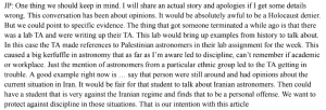 JP was likely referring to a teaching assistant who added lab notes to an astronomy class session that read, “As we watch genocide unfold in Gaza, it is also important to tell the story of Palestinians outside of being the subjects of a military occupation,” the Columbia Spectator reported in January 2025. The university condemned the insertion of “political views within the lab notes for a class session.”