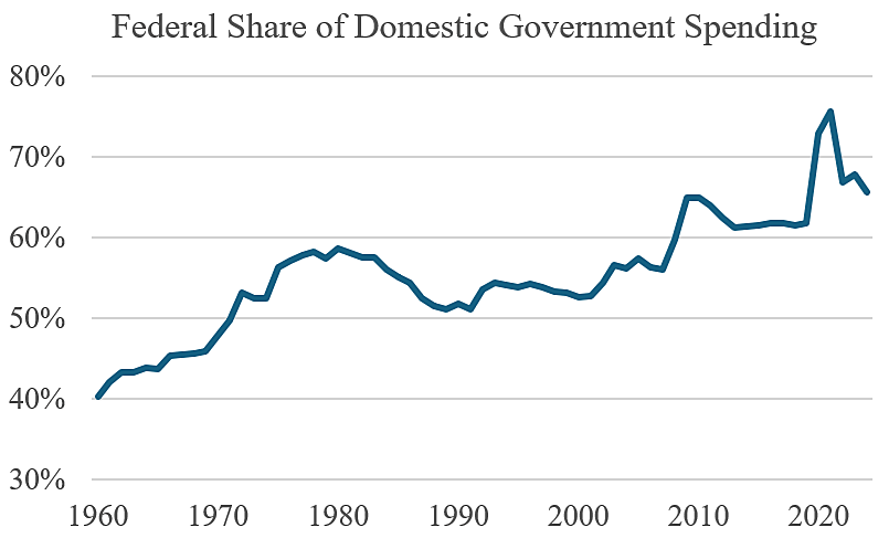 The federal share of spending rose from 40 percent in 1960 to 66 percent by 2024. The earliest BEA data is for 1929. In that year, before the New Deal and World War II, the federal share of government spending was less than 20 percent.