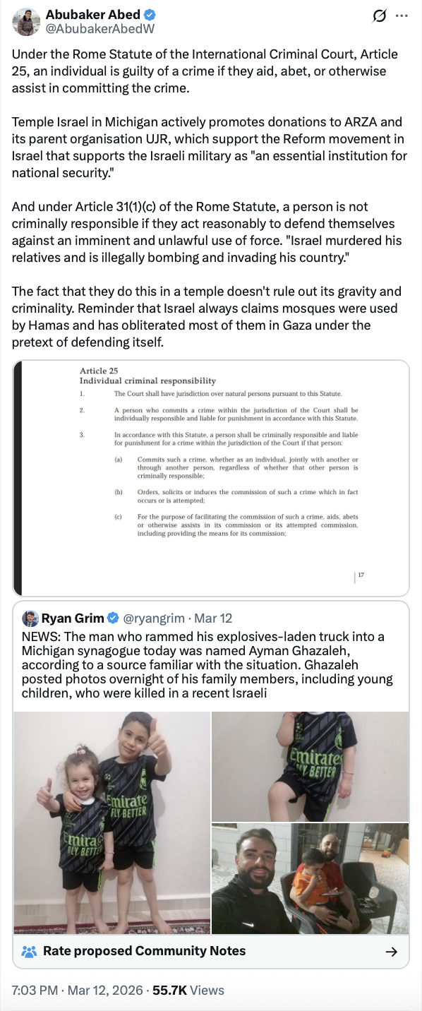 “Under the Rome Statute of the International Criminal Court, Article 25, an individual is guilty of a crime if they aid, abet, or otherwise assist in committing the crime,” he wrote. “Temple Israel in Michigan actively promotes donations to ARZA and its parent organisation [URJ], which support the Reform movement in Israel that supports the Israeli military as ‘an essential institution for national security.'”