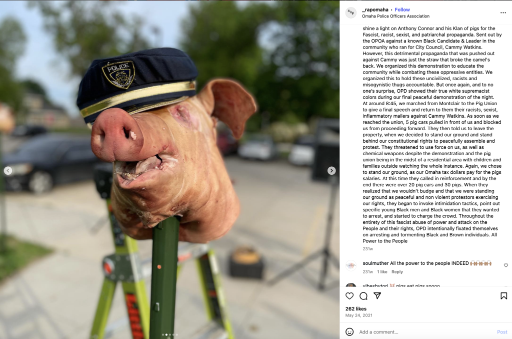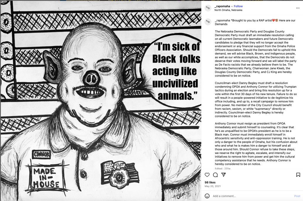 Ramsey, who locked down his Instagram account after a request for comment, attended another RAP event in August 2021, where he posted photos of a chalk drawing that read “Cops Kill.” Ramsey also “liked” social media posts from the group, including a cartoon that depicted Omaha police union president Anthony Conner as a pig. The post called on Conner to resign from the police union and threatened to “agitate, escalate, and intensify” its efforts if he refused to do so. “Anthony Connor [sic] is hereby considered to be on notice,” RAP stated.