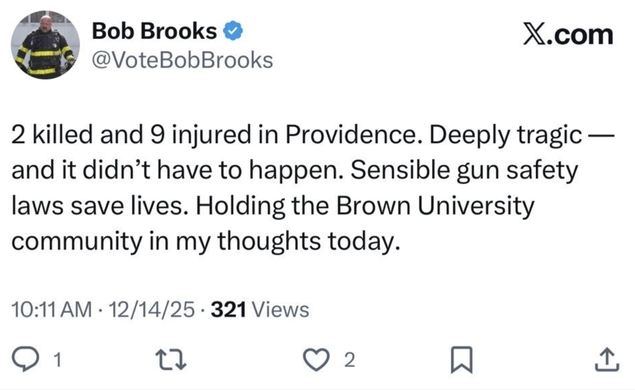 “2 killed and 9 injured in Providence,” Brooks wrote at 10:11 a.m. “Deeply tragic — and it didn’t have to happen. Sensible gun safety laws save lives. Holding the Brown University community in my thoughts today.”