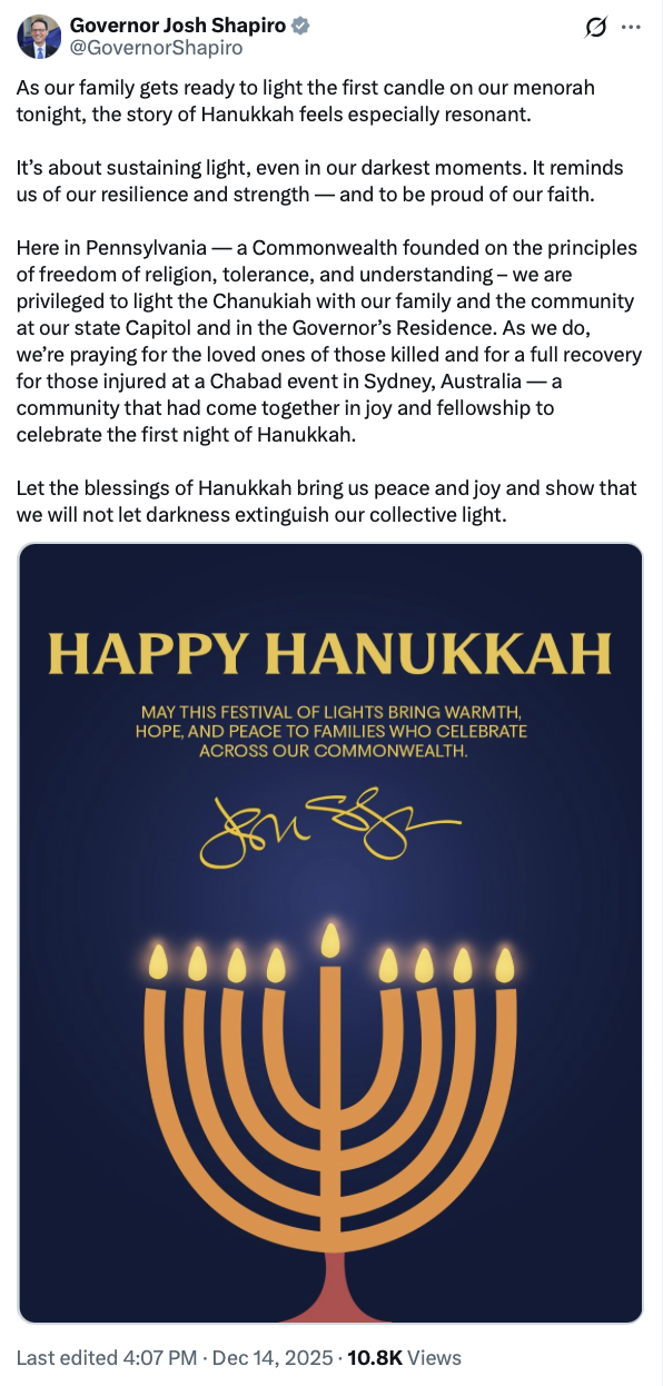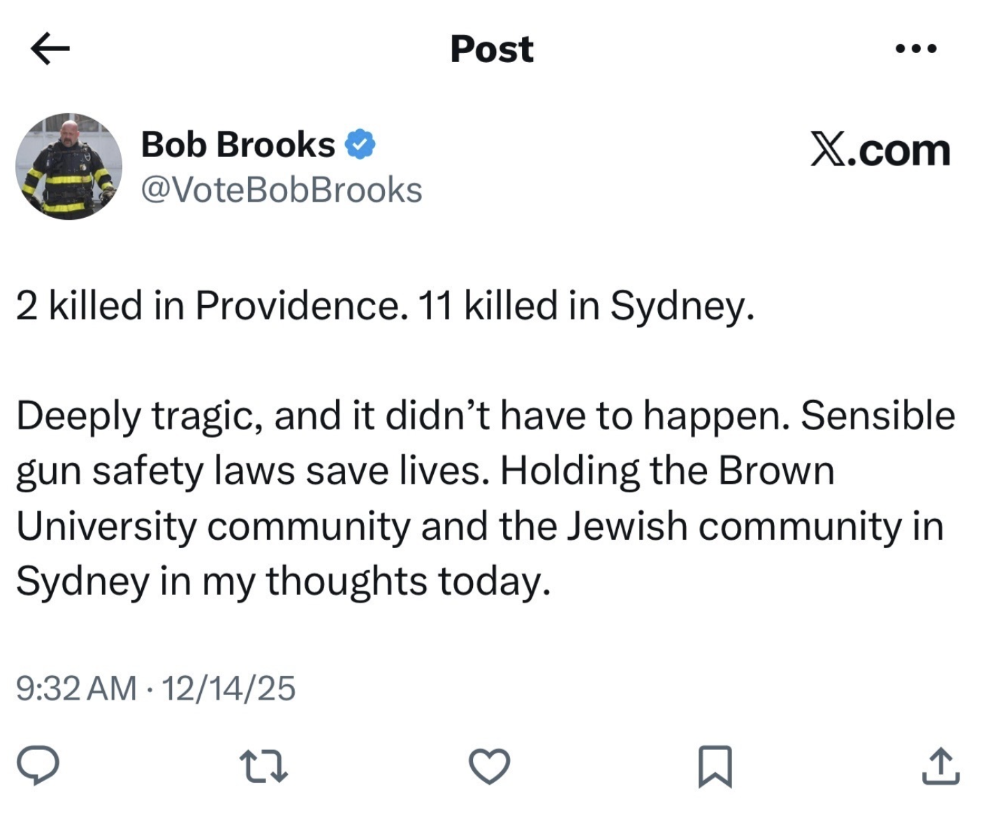 “2 killed in Providence,” Bob Brooks, a Democrat running for Pennsylvania’s Seventh Congressional District against Republican incumbent Ryan Mackenzie, posted at 9:32 a.m. on Sunday. “11 killed in Sydney. Deeply tragic, and it didn’t have to happen. Sensible gun safety laws save lives. Holding the Brown University community and the Jewish community in Sydney in my thoughts today.”