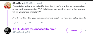 “I’m probably going to be trolled for this, but if you’re a white man running in a primary with a progressive POC, I challenge you to ask yourself in this moment ‘is my voice more important?’ And if you think it is, your campaign is more about you than your policy agenda,” Behn wrote in a since-deleted X post on June 6, 2020.