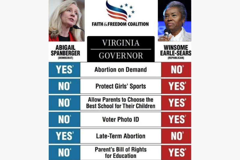 Under her “Growing Virginia Plan,” Spanberger proposed expansive workforce programs, dual-enrollment initiatives, and infrastructure investment — something that Republicans maintain will bring more unnecessary taxes and debt burdens on hard-working Virginia families. Spanberger is also in alignment with left-wing social agenda issues. She supports access to abortion, contraception, and in vitro fertilization (IVF). She has backed legislation to codify the protections of Roe v. Wade into federal law and has expressed support for maintaining access to abortions across state lines. As governor, Spanberger has also stated that she would sign legislation protecting these “rights” in Virginia.