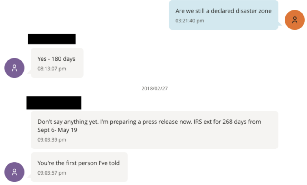 In an exchange on Feb. 27, 2018, Plaskett informed Epstein that the IRS had extended a tax break for residents of the Virgin Islands after hurricanes hit the territory.