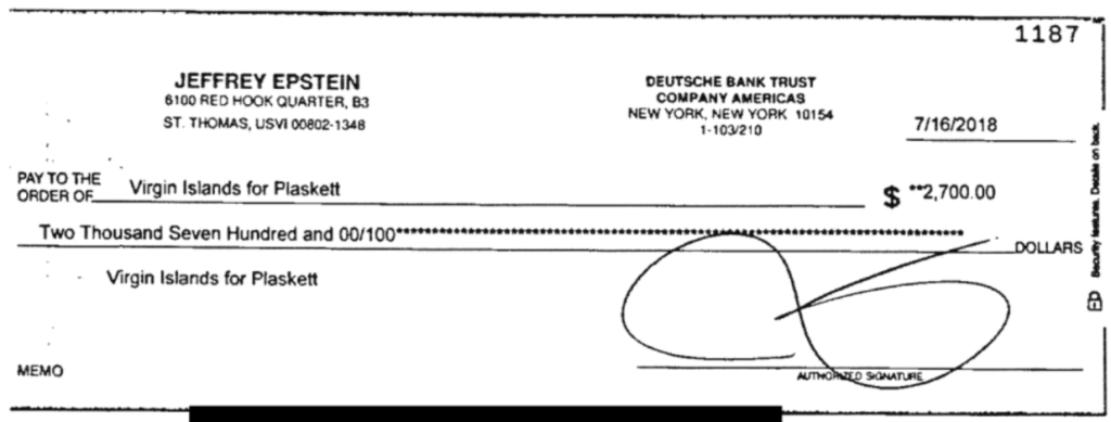 Epstein and several of his employees donated to Plaskett’s campaigns in 2016 and 2018. The latest tranche of documents includes a $2,700 check that Epstein wrote Plaskett’s campaign on July 16, 2018.