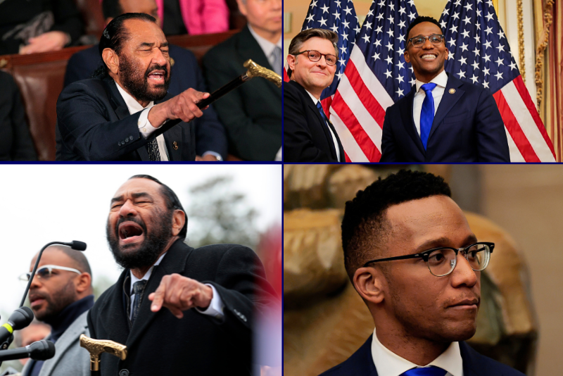 (L-top) Rep. Al Green (D-TX) on November 20, 2025. (Photo by Heather Diehl/Getty Images) / (L-bottom) Rep. Al Green (D-TX) shouts out on March 04, 2025 in Washington, DC. (Photo by Chip Somodevilla/Getty Images) / (R-top) U.S. Speaker of the House Mike Johnson (R-LA) (L) swears in Rep. Christian Menefee (D-TX). (Photo by Heather Diehl/Getty Images)