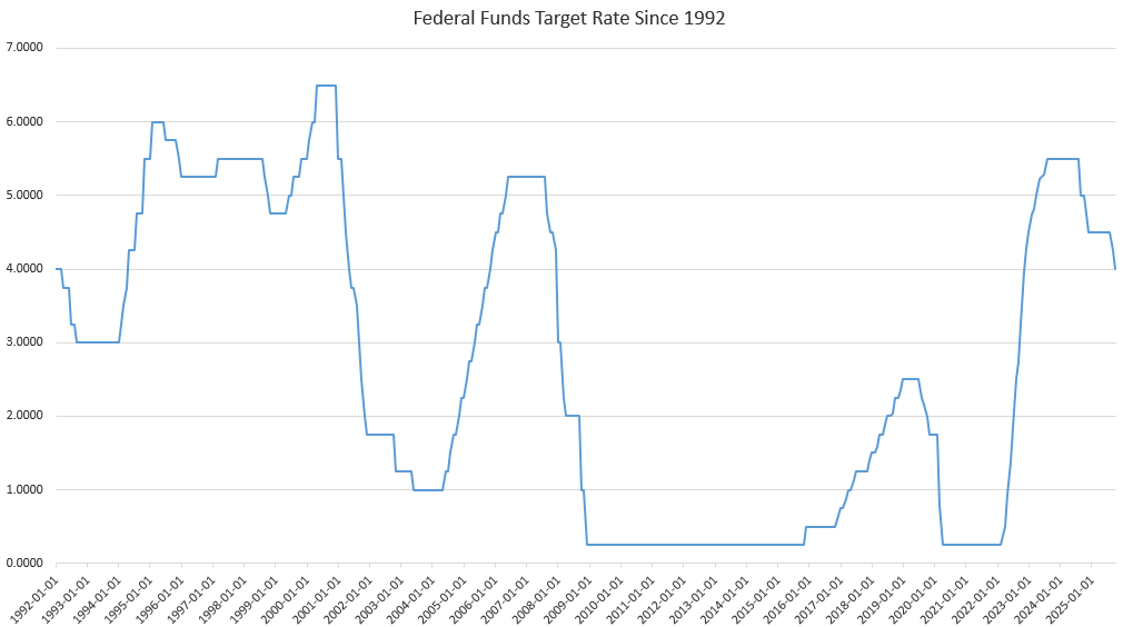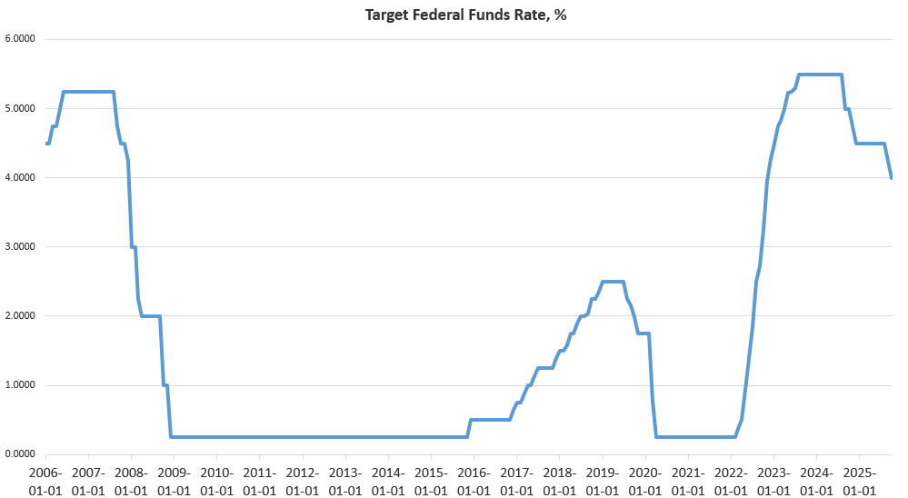 The Federal Reserve’s Federal Open Market Committee (FOMC) on Wednesday voted to again reduce the target policy interest rate by 25 basis points, down to an upper bound of 4.0 percent. The FOMC has now cut the policy rate (i.e., the federal funds rate) five times since September 2024, totaling a reduction in 150 basis points over 13 months.
