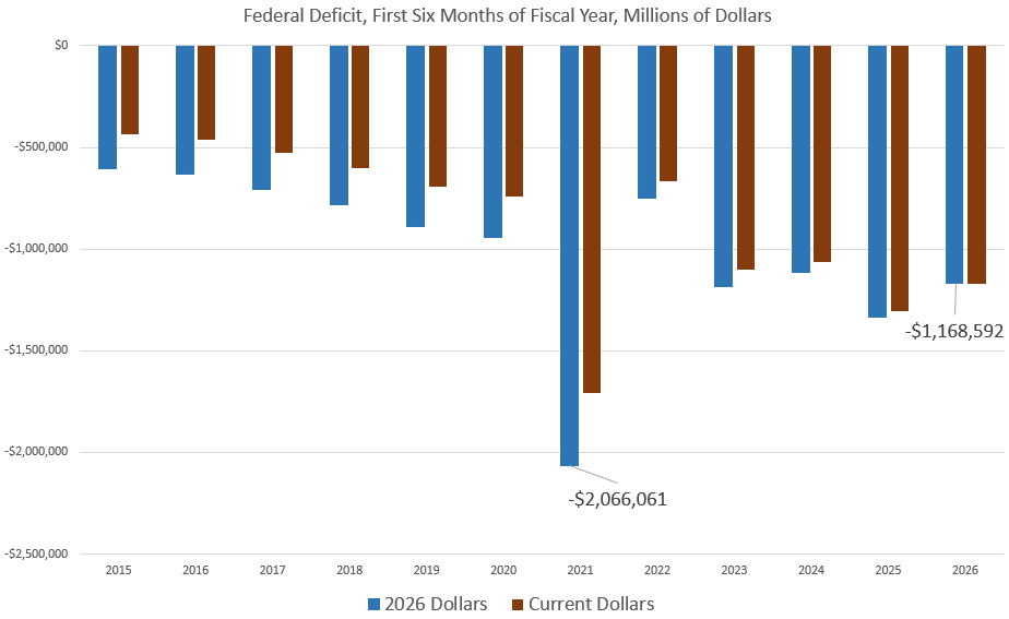 Looking at the first six months of the current fiscal year combined—a period which began on October 1, 2025—federal spending was up by $83.9 billion, or 2.3 percent. At $3.6 trillion for the fiscal year so far, that’s the highest level of spending ever, and is now even higher than spending during the days of juiced-up covid-panic outlays. Even when adjusted for inflation, 2026’s spending for the first six months of this fiscal year is at the highest level for every year except for 2021. In other words, the only other year with higher spending was the year when Trump ratcheted up spending toward the end of the 2020 calendar year—which was an election year. Trump continued to push historically high spending levels for the first four months of the 2021 fiscal year, until he finally left office at the end of January 2021.