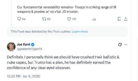 “I personally think we should have crushed their ballistic & nuke capes, but Trump has a plan, he has definitely earned the confidence of any clear eyed observer,” Kent wrote on Jan. 19, 2020, in response to a since-deleted post.