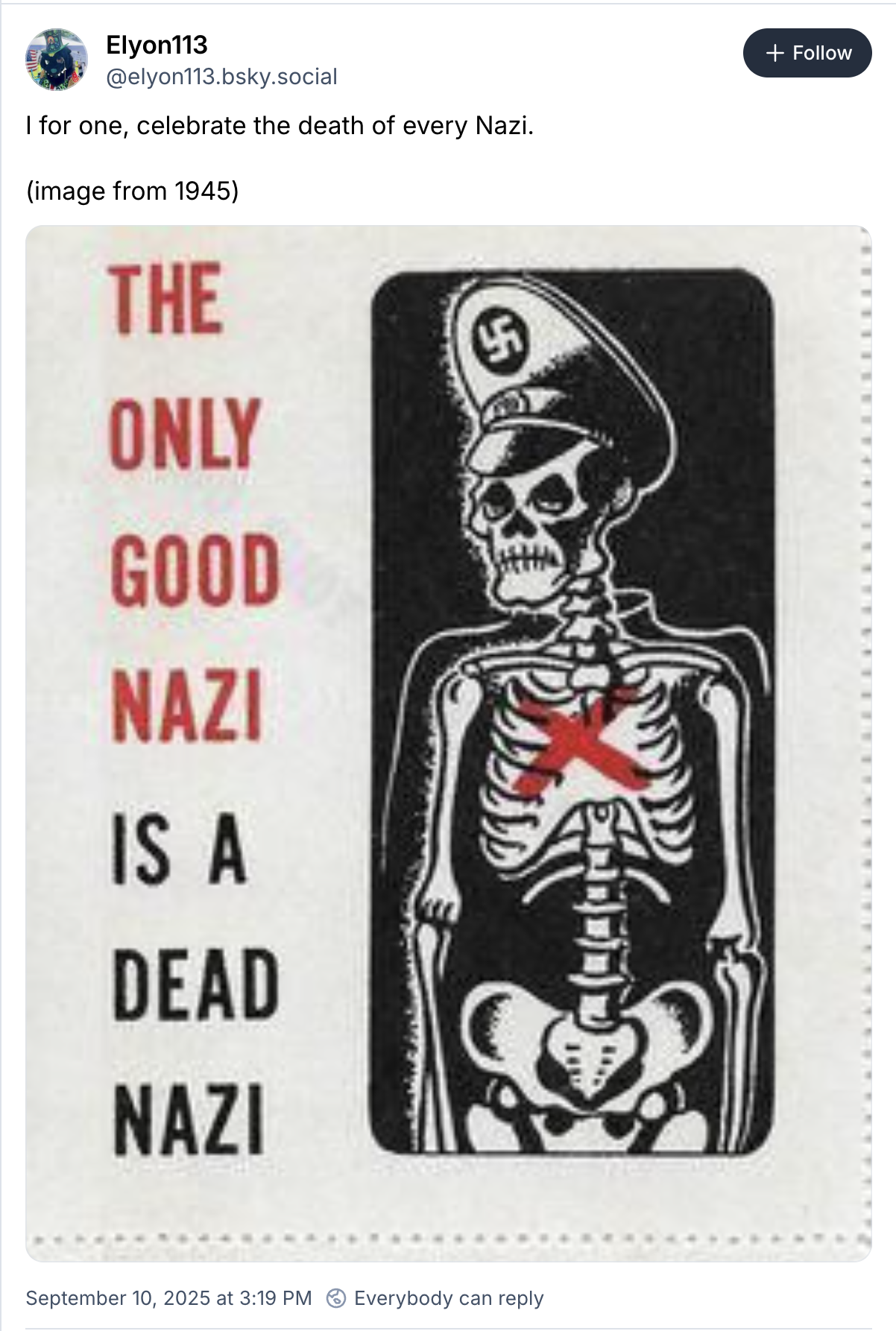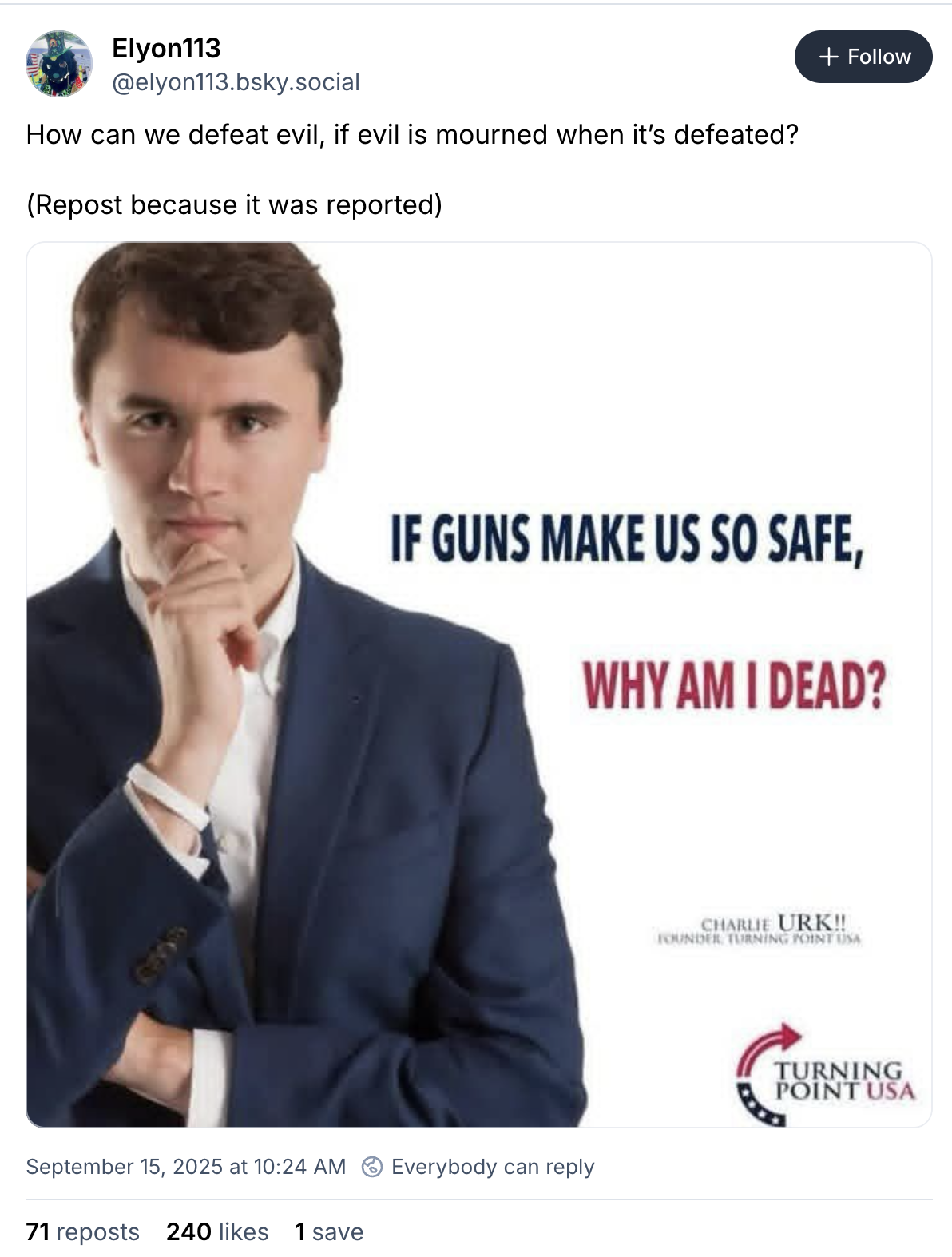 Just after Kirk’s assassination in September, Smeltzer posted a meme on Bluesky reading, “If guns make us so safe, why am I dead?” He added, “How can we defeat evil, if evil is mourned when it’s defeated?”
