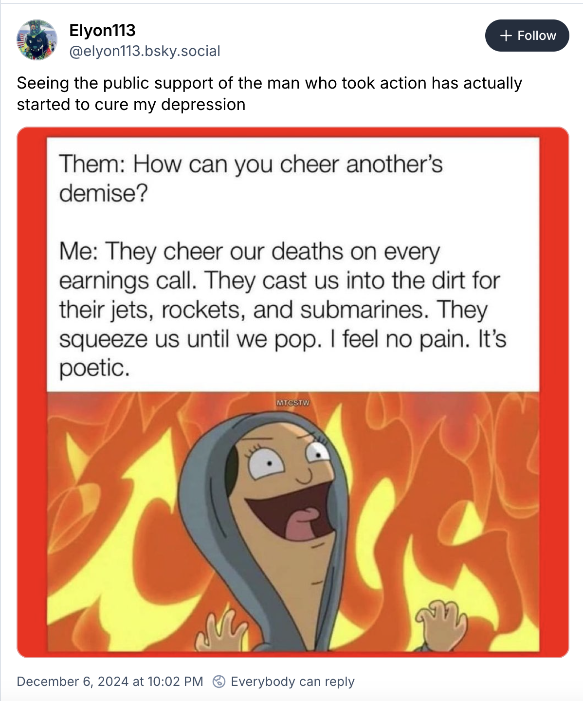 Two days after the assassination of Thompson, he seemed to praise alleged gunman Luigi Mangione, writing on Bluesky, “Seeing the public support of the man who took action has actually started to cure my depression.”