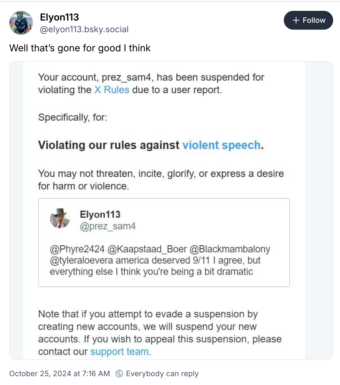 In October 2024, Smeltzer posted a screenshot of an email from X support showing that he had been banned from the app for writing, “America deserved 9/11.”