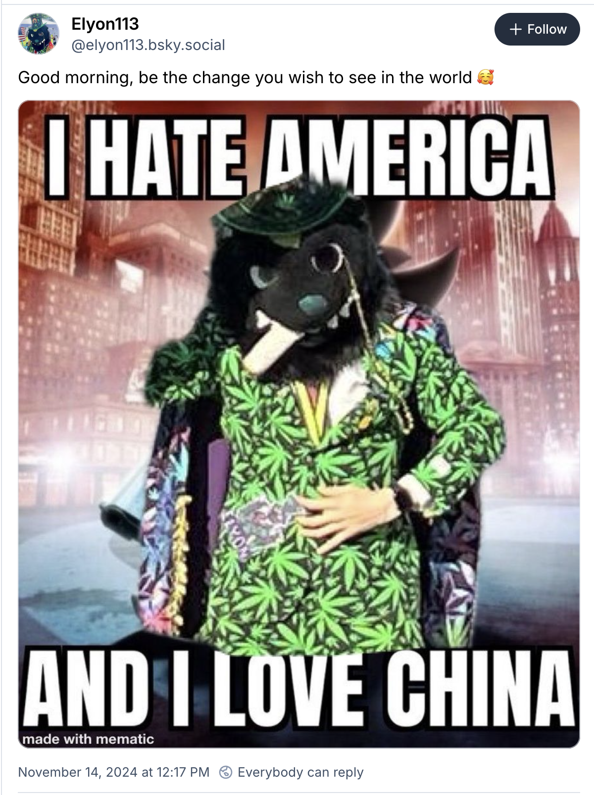 Smeltzer’s social media activity also includes posts of himself in a fursuit lying down on a pentagram and saying he hates the United States and loves China.