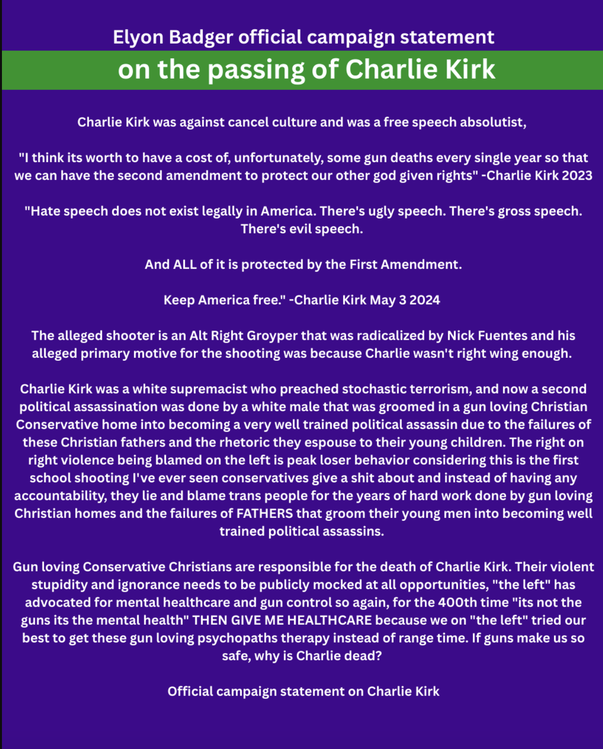 A “furry” who identifies as a honey badger, celebrated the assassinations of Charlie Kirk and UnitedHealthcare CEO Brian Thompson, and was banned from X for saying “america deserved 9/11” is running in the Democratic primary for a competitive House seat in Michigan.