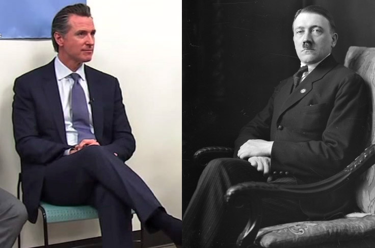 If we’re being uncharitable, we’d note the alarming postural similarities between Newsom and Adolf Hitler.