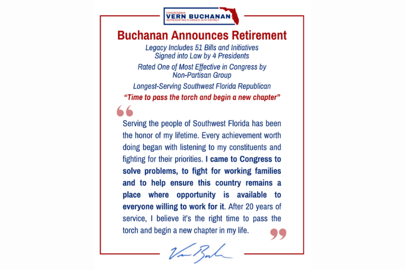 “Serving the people of Southwest Florida has been the honor of my lifetime,” Buchanan (R-Fla.) said. “After 20 years of service, I believe it’s the right time to pass the torch and begin a new chapter in my life.”