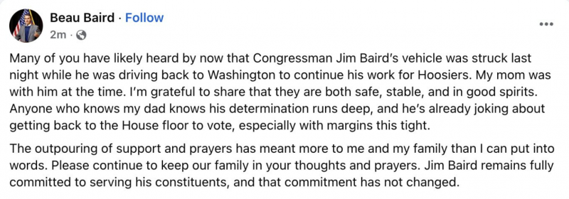 Nonetheless, Beau Baird, the congressman’s son and an Indiana state representative, posted a statement on social media explaining that although his parents’ vehicle was involved in an accident, causing it to roll multiple times, both his father and mother remain stable, responsive, in good spirits and are expected to make full recoveries.