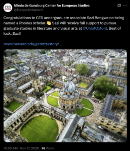 Harvard’s Center for European Studies congratulated Bongwe on his selection Monday in a post on X.