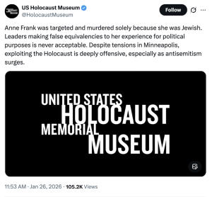“Anne Frank was targeted and murdered solely because she was Jewish. Leaders making false equivalencies to her experience for political purposes is never acceptable,” the museum said on X. “Despite tensions in Minneapolis, exploiting the Holocaust is deeply offensive, especially as antisemitism surges.”