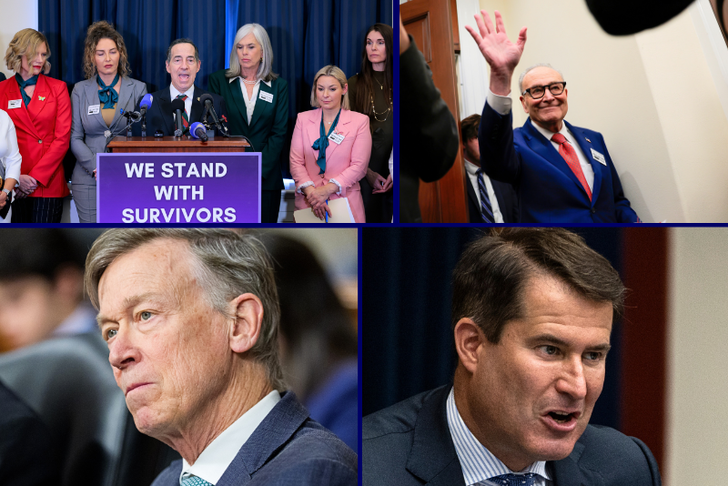 (L-top) Democratic Women’s Caucus with Epstein survivors ahead of State of the Union address. (Photo by Heather Diehl/Getty Images) / (L-bottom) Sen. John Hickenlooper. (Photo by Aaron Schwartz/Getty Images) / (R-top) Rep. Jamie Raskin. (Photo by Heather Diehl/Getty Images) / (R-bottom) U.S. Rep. Seth Moulton. (Photo by Samuel Corum/Getty Images)