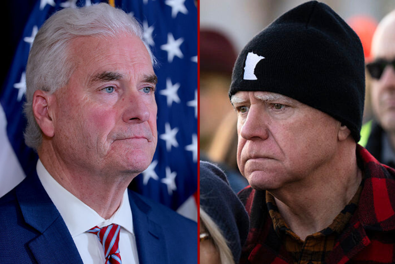 (Left) U.S. House Majority Whip Tom Emmer (R-MN) listens on December 02, 2025 in Washington, DC. (Photo by Anna Moneymaker/Getty Images) / (Right) Minnesota Gov. Tim Walz (R) on January 09, 2026 in St. Paul, Minnesota. (Photo by Stephen Maturen/Getty Images)