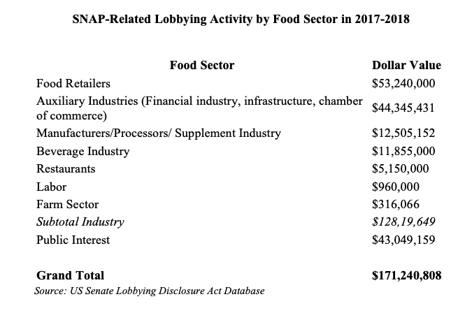 Throughout the 1960s and until recent times, food stamps have enjoyed strong support from the agriculture industry. As retailers and processors displaced farmers in capturing an ever-greater share of the food dollar, their importance as stakeholders for the program grew. In the 2018 Farm Bill, banks, refrigeration equipment manufacturers and even the U.S. Chamber of Commerce join food retailers, beverage companies, and manufacturers as key stakeholders in the SNAP program. These players have evolved into much more important participants in the program than farm groups, as evidenced by the amount of money they spend on lobbying.