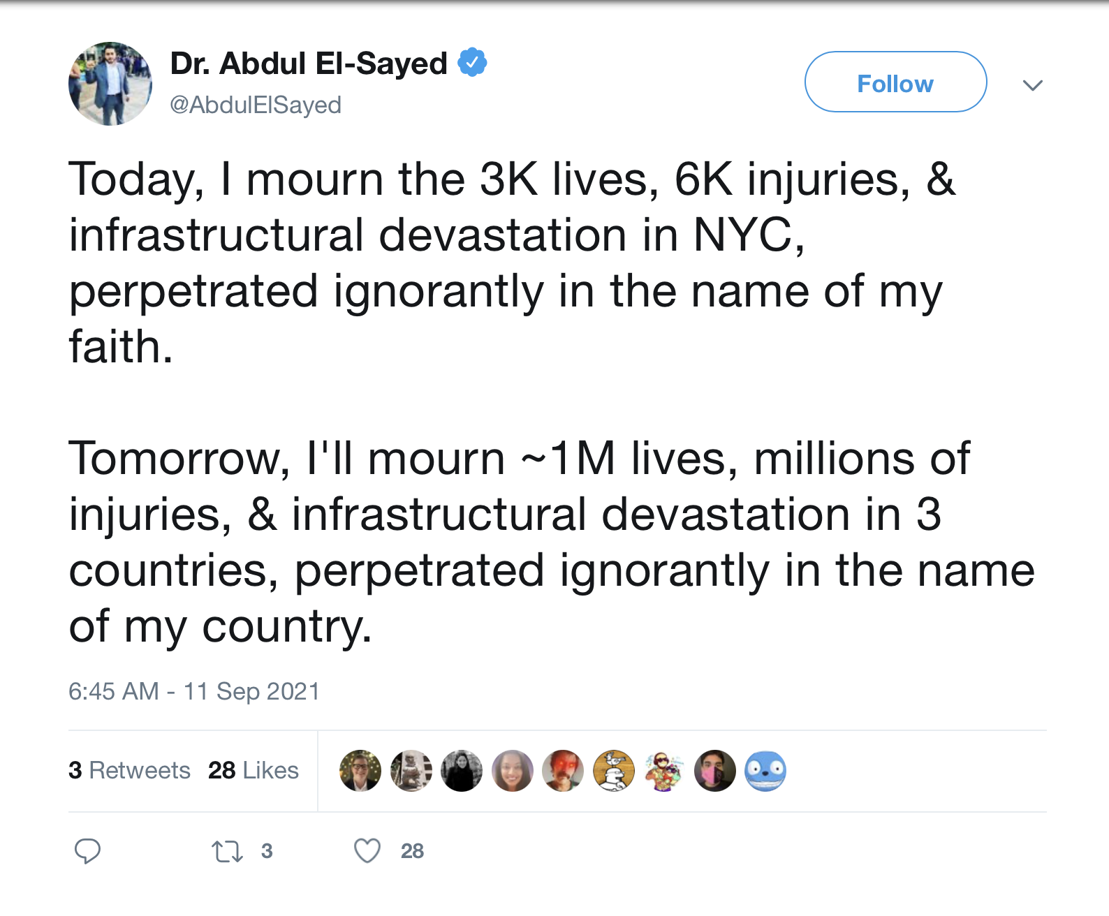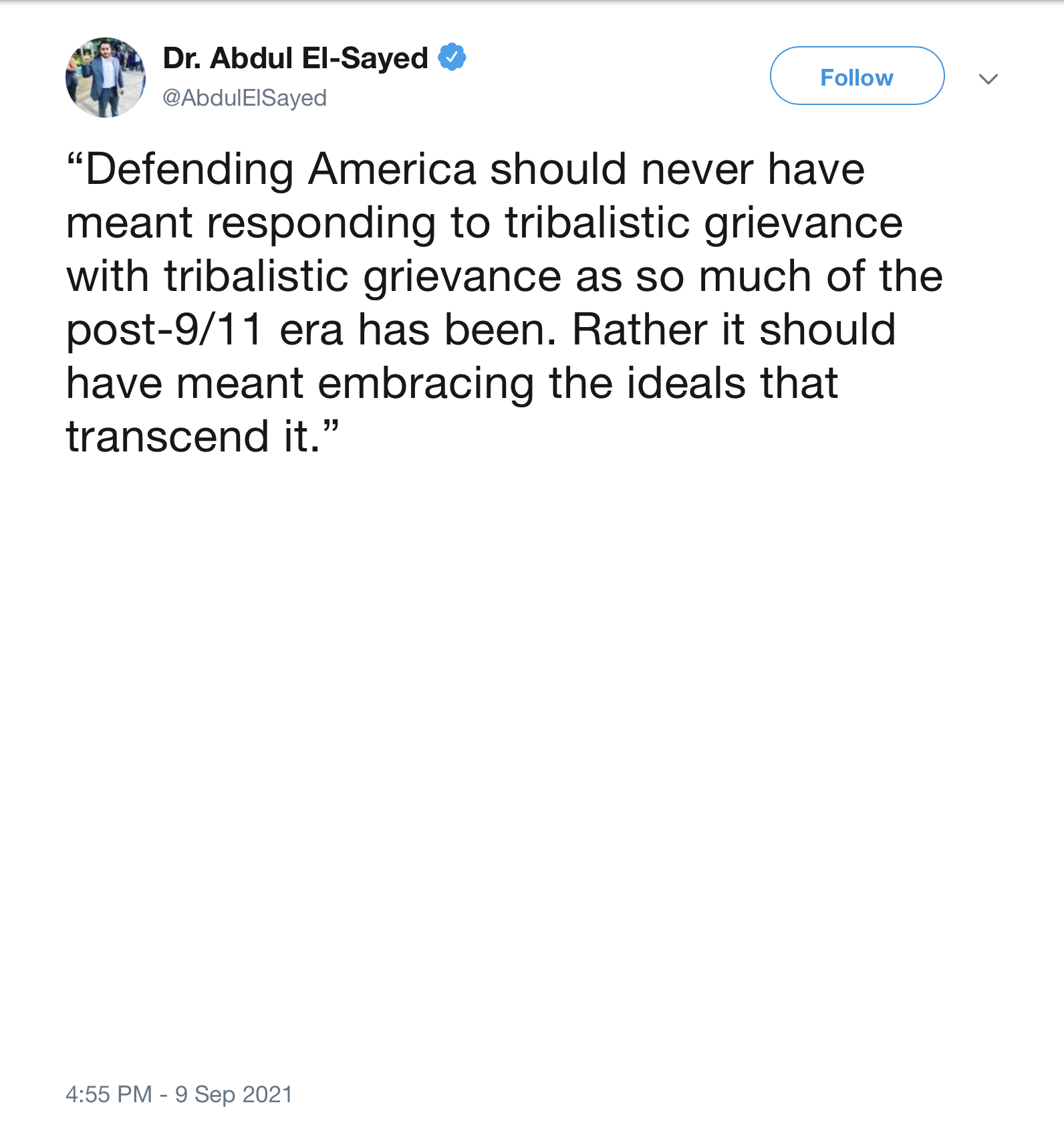 “Today, I mourn the 3K lives, 6K injuries, & infrastructural devastation in NYC, perpetrated ignorantly in the name of my faith,” El-Sayed wrote on the 20th anniversary of the terror attack that claimed nearly 3,000 innocent lives. “Tomorrow, I’ll mourn ~1M lives, millions of injuries, & infrastructural devastation in 3 countries, perpetrated ignorantly in the name of my country.”