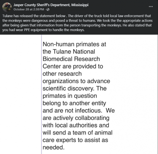 “On 10/28/25 a wreck occurred on I59 near mile marker 117. This was a truck carrying Rehsus [rhesus] monkeys from Tulane University. The monkeys are approximately 40lbs, they are aggressive to humans and they require PPE to handle. The monkeys carry hepatitis C, herpes, and COVID. Tulane University has been notified and will send a team to pick up the monkeys tomorrow ( the ones that are still caged),” the Jasper County Sheriff’s Department initially posted on Facebook.