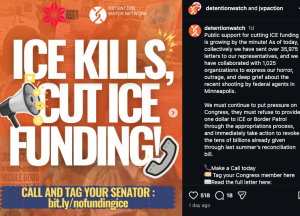 “Detention Watch Network (DWN) and JVP Action are partnering to urge you to tell your Senators to vote NO on funding for ICE and [Customs and Border Protection],” the form reads. They promoted their efforts on a coauthored Instagram post on Wednesday that prominently displayed both of their logos.