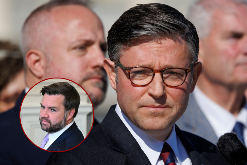 (L) (L/R) US Vice President JD Vance on November 5, 2025, in Washington, DC. (Photo by SAUL LOEB/AFP via Getty Images) / (R) House Speaker Mike Johnson (R-LA) speaks at the podium on November 5, 2025 on Capitol Hill in Washington, DC. (Photo by Tom Brenner/Getty Images)